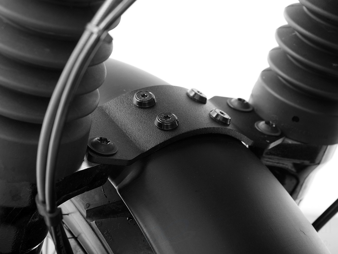 スワイプでスクロール、クリック(タップ)で拡大表示 | アルミ製マッドガードと職人の手作業で曲げ、溶接したホルダーのキット。 リヤタイヤに沿うように設置するフェンダーは水しぶきを確実に防ぎつつ フェンダーレス化した車体のデザインを崩しません。 また、そのホルダーもデザインとしての大きな役割を持ち、スパルタンなイメージを演出。 走行振動を抑える安心設計。 |