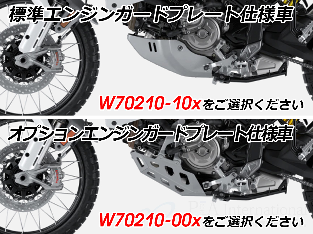 | 適合車種 | DUCATI DesertX ※ワンダーリッヒのフェアリングプロテクション(【品番】W70210-xxx)との併設不可 DesertX Discovery ※ワンダーリッヒのフェアリングプロテクション(【品番】W70210-xxx)との併設不可 DesertX Rally ※ワンダーリッヒのフェアリングプロテクション(【品番】W70210-xxx)との併設不可 |