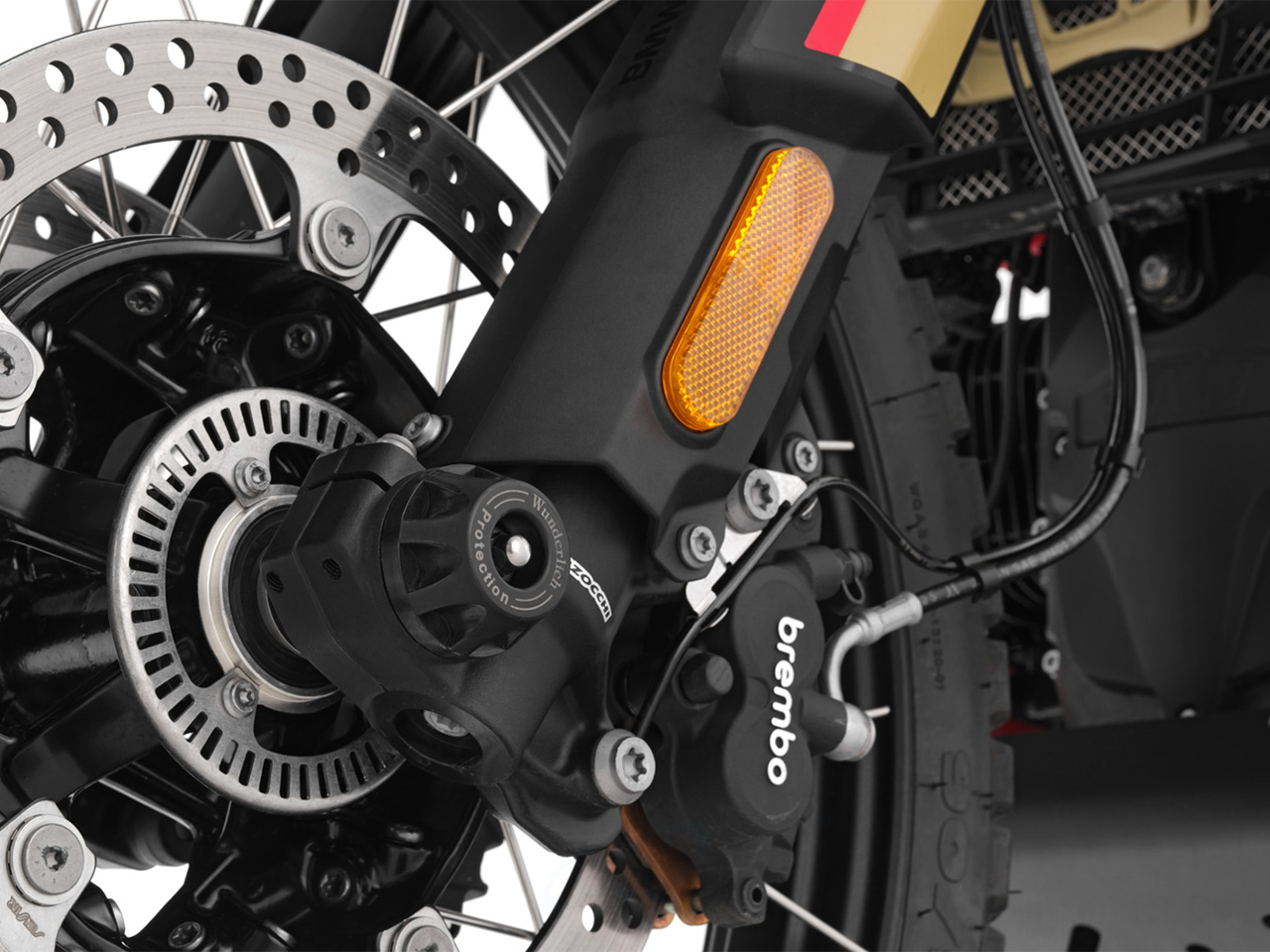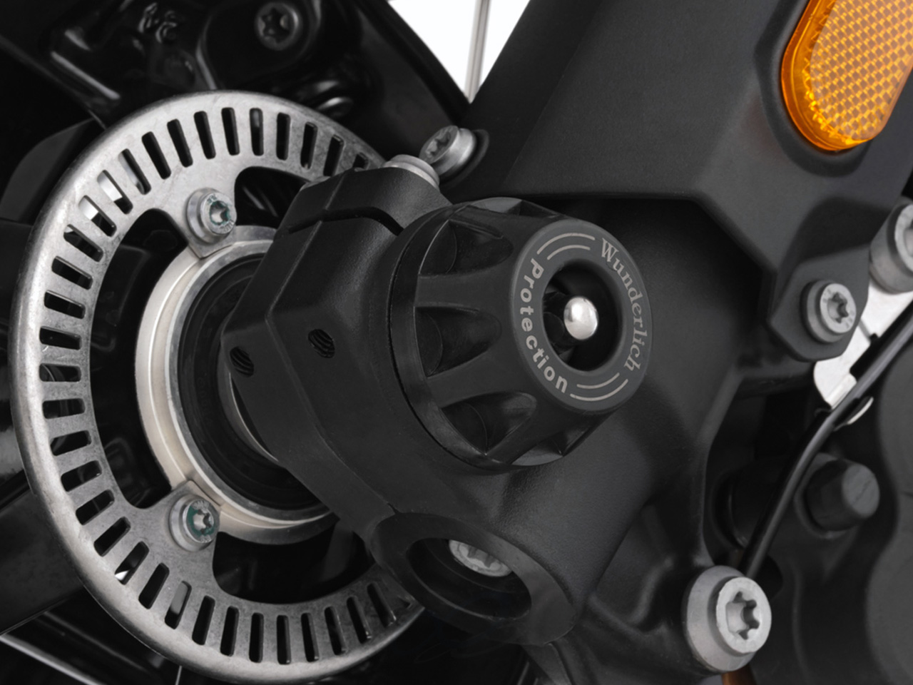 スワイプでスクロール、クリック(タップ)で拡大表示 | 万が一の転倒時に車体をスライドさせ、車体へのダメージを軽減。 ブレーキキャリバーなどを守るプロテクターとなります。 フロントアクスルへ簡単に設置が可能。 特殊な弾性樹脂により、衝撃吸収性を有します。 パットは抵抗値の異なる素材を使用した二重構造。アクシデントの初期段階では車体をスライドさせダメージを軽減。パットが削れるにつれ抵抗が増加し、車体を停止させます。 |